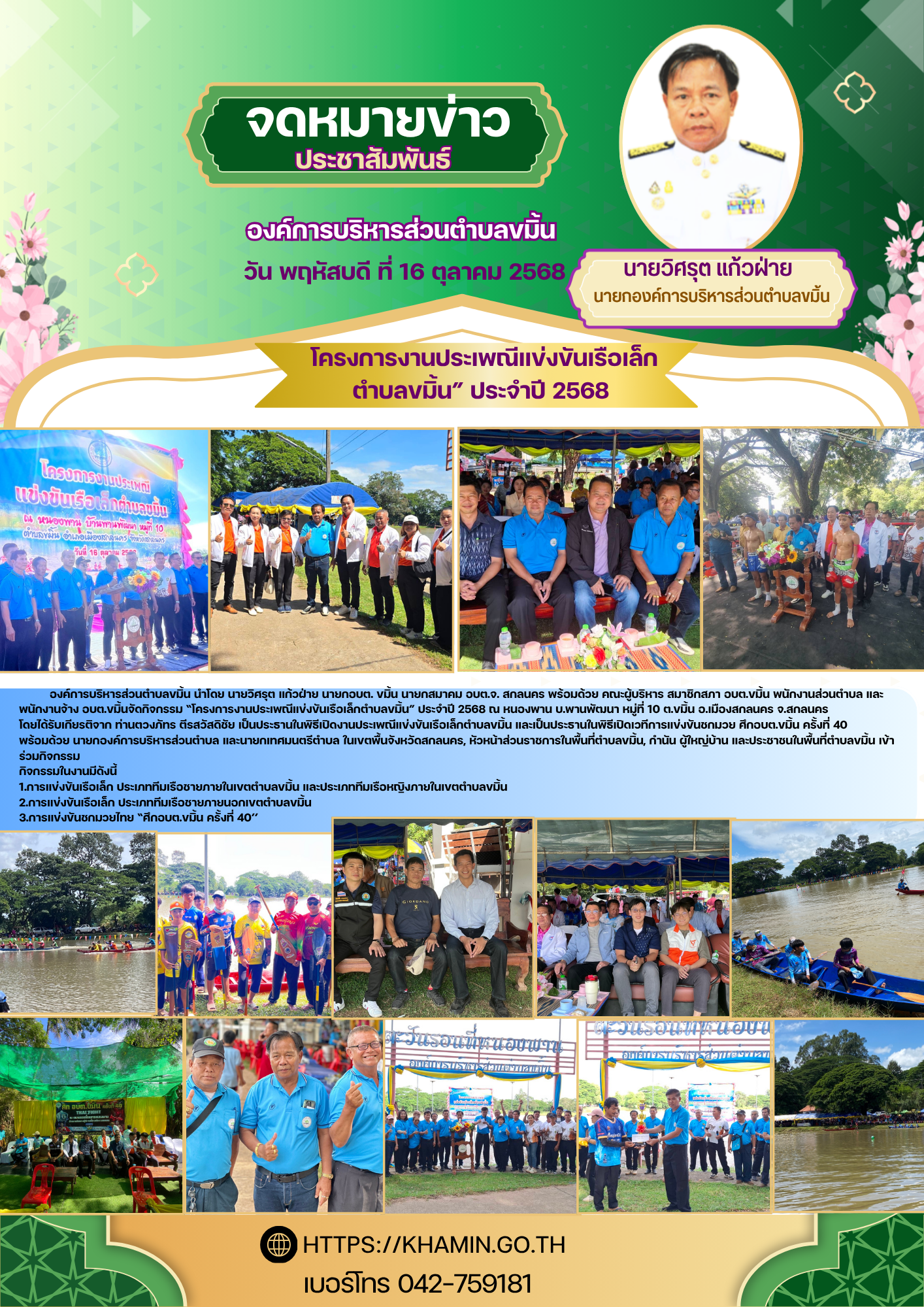 จัดกิจกรรม “โครงการงานประเพณีแข่งขันเรือเล็กตำบลขมิ้น” ประจำปี 2568 ณ หนองพาน บ.พานพัฒนา หมู่ที่ 10 ต.ขมิ้น อ.เมืองสกลนคร จ.สกลนคร