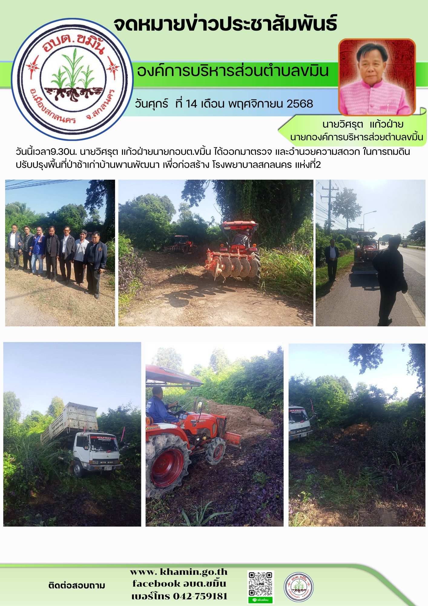 นายวิศรุต แก้วฝ่ายนายกอบต.ขมิ้น ได้ออกมาตรวจ และอำนวยความสดวก ในการถมดิน ปรับปรุงพื้นที่ป่าช้าเก่าบ้านพานพัฒนา เพื่อก่อสร้าง โรงพยาบาลสกลนคร แห่งที่2 พื้นที่ก่อสร้างป่าช้าเก่าบ้านพานพัฒนา ต.ขมิ้นอ.เมืองจ.สกลนคร