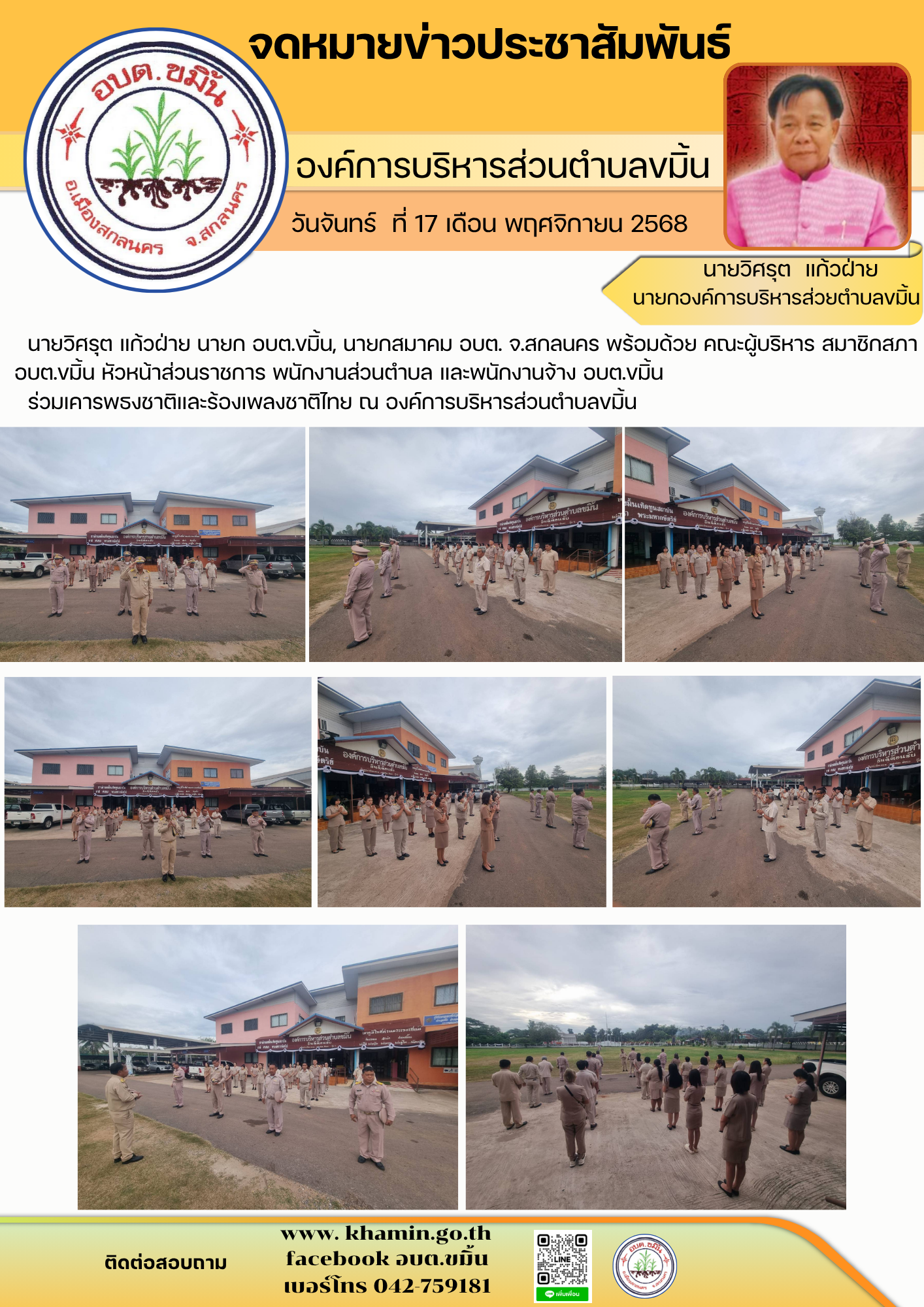 นายวิศรุต แก้วฝ่าย นายก อบต.ขมิ้น, นายกสมาคม อบต. จ.สกลนคร พร้อมด้วย คณะผู้บริหาร สมาชิกสภา อบต.ขมิ้น หัวหน้าส่วนราชการ พนักงานส่วนตำบล และพนักงานจ้าง อบต.ขมิ้น