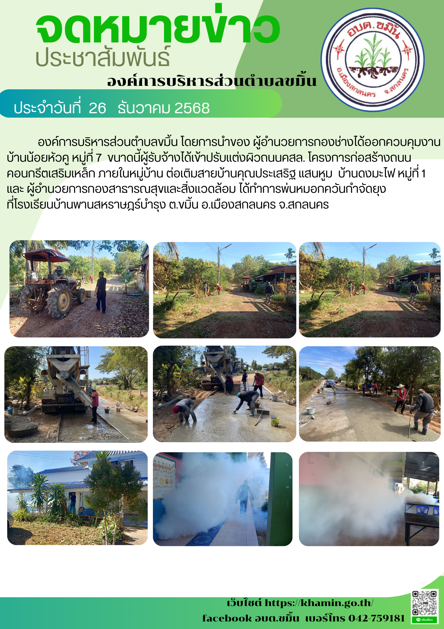 องค์การบริหารส่วนตำบลขมิ้น โดยการนำของ ผู้อำนวยการกองช่างได้ออกควบคุมงาน บ้านน้อยหัวคู หมู่ที่ 7 ขนาดนี้ผู้รับจ้างได้เข้าปรับแต่งผิวถนนคสล. โครงการก่อสร้างถนนคอนกรีตเสริมเหล็ก ภายในหมู่บ้าน ต่อเติมสายบ้านคุณประเสริฐ แสนหูม บ้านดงมะไฟ หมู่ที่ 1