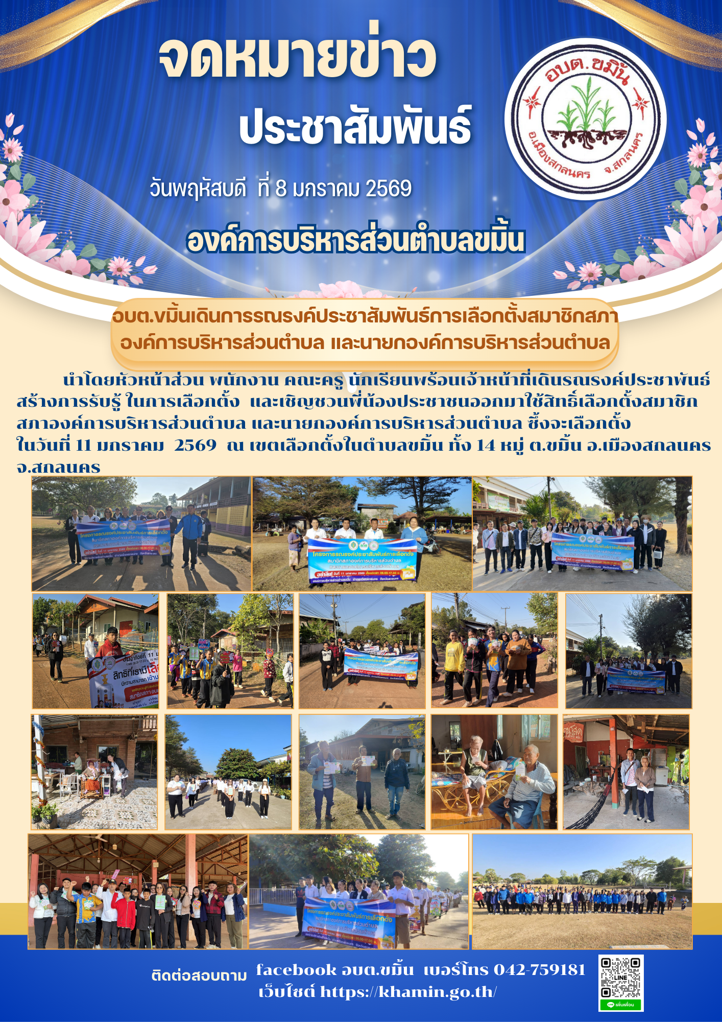 องค์การบริหารส่วนตำบลขมิ้น นำโดยหัวหน้าส่วน พนักงาน คณะครู นักเรียนพร้อมเจ้าหน้าที่เดินรณรงค์ประชาพันธ์สร้างการรับรู้ ในการเลือกตั้ง และเชิญชวนพี่น้องประชาชนออกมาใช้สิทธิ์เลือกตั้งสมาชิกสภาองค์การบริหารส่วนตำบล และนายกองค์การบริหารส่วนตำบล ซึ่งจะเลือกตั้งในวันที่ 11 มกราคม 2569   ณ ในเขตพื้นที่ตำบลขมิ้น  อำเภอเมืองสกลนคร จังหวัดสกลนคร