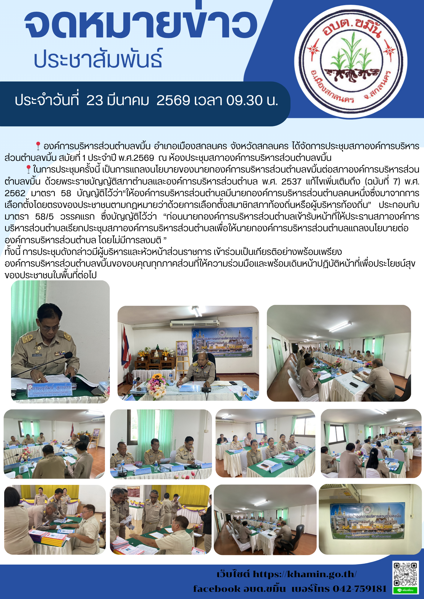 📍องค์การบริหารส่วนตำบลขมิ้น อำเภอเมืองสกลนคร จังหวัดสกลนคร ได้จัดการประชุมสภาองค์การบริหารส่วนตำบลขมิ้น สมัยที่ 1 ประจำปี พ.ศ.2569 ณ ห้องประชุมสภาองค์การบริหารส่วนตำบลขมิ้น