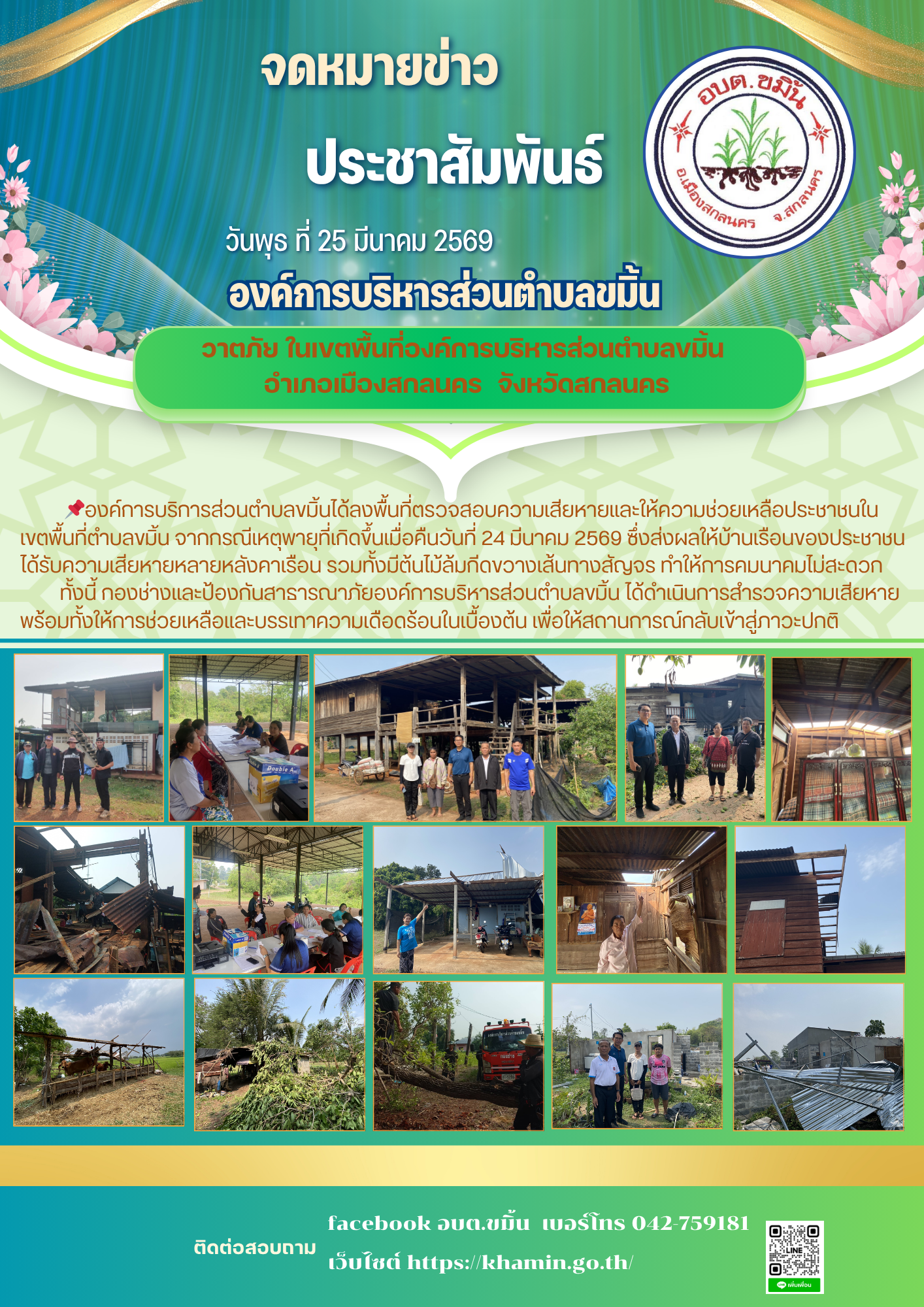 ได้ลงพื้นที่ตรวจสอบความเสียหายและให้ความช่วยเหลือประชาชนในเขตพื้นที่ตำบลขมิ้น จากกรณีเหตุพายุที่เกิดขึ้นเมื่อคืนวันที่ 24 มีนาคม 2569 ซึ่งส่งผลให้บ้านเรือนของประชาชนได้รับความเสียหายหลายหลังคาเรือน รวมทั้งมีต้นไม้ล้มกีดขวางเส้นทางสัญจร ทำให้การคมนาคมไม่สะดวก