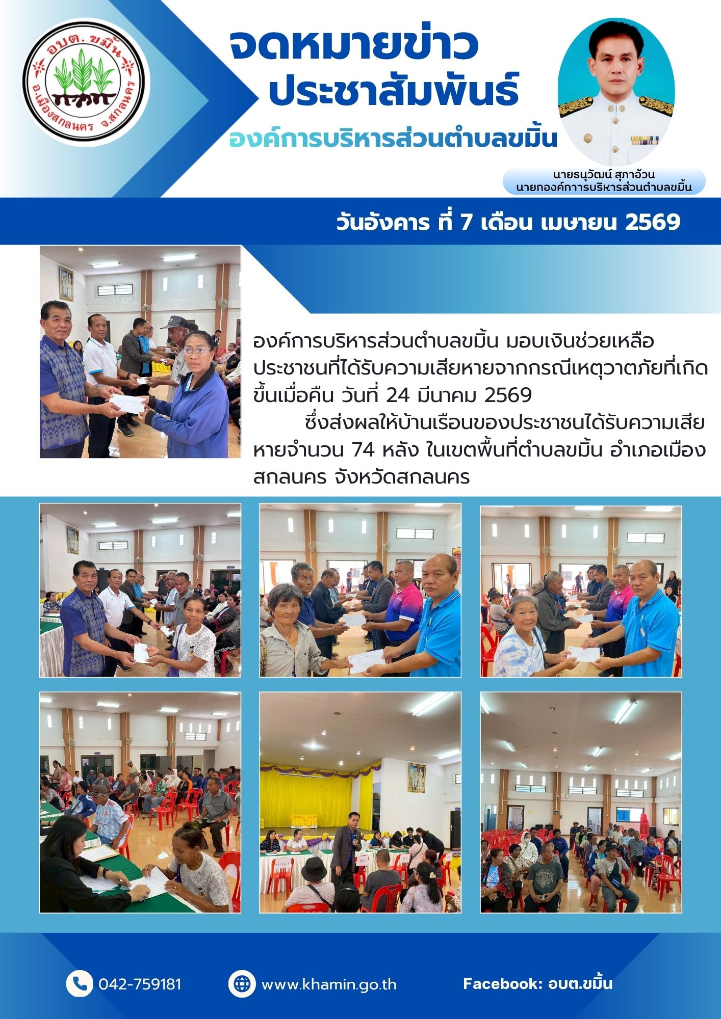 องค์การบริหารส่วนตำบลขมิ้นมอบเงินช่วยเหลือประชาชนที่ได้รับความเสียหายจากกรณีเหตุพายุที่เกิดขึ้นเมื่อคืนวันที่ 24 มีนาคม 2569