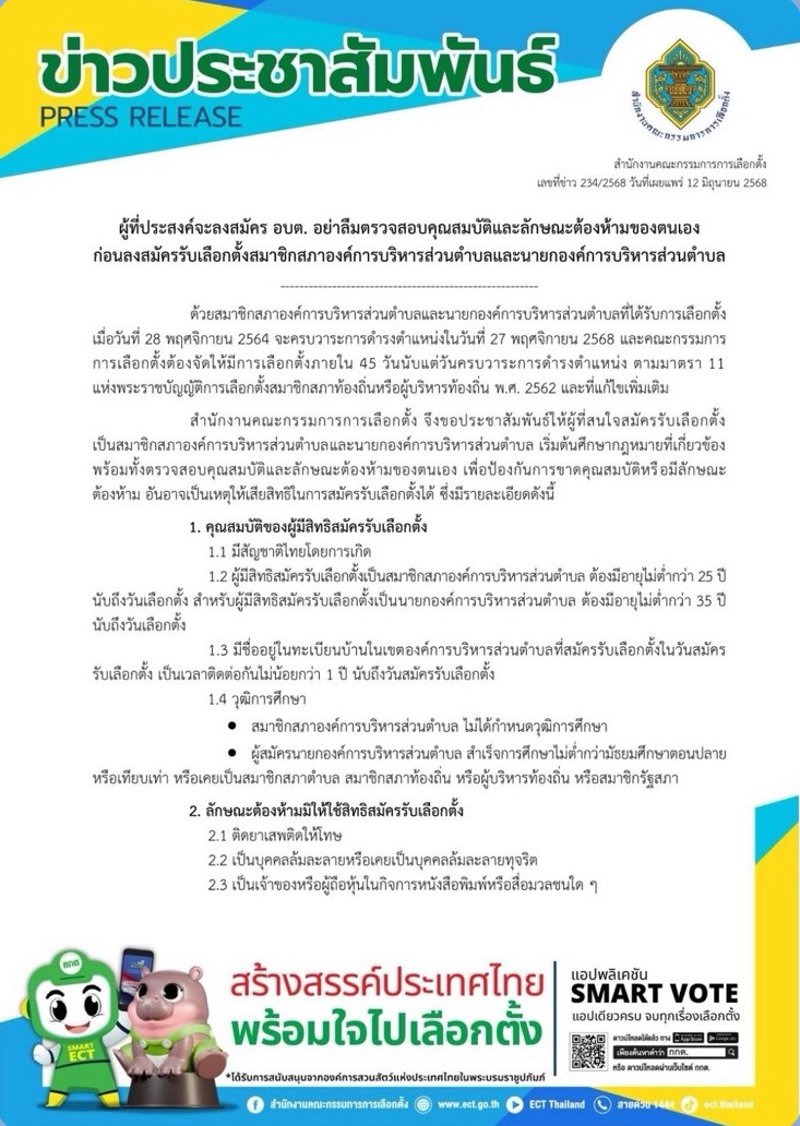 ข่าวประชาสัมพันธ์ผู้ที่จะประสงค์ลงสมัคร อบต. อย่าลืมตรวจสอบคุณสมบัติและลักษณะต้องห้ามของตนเองก่อนลงสมัครเลือกตั้ง สมาชิกองค์การบริหารส่วนตำบลและนายกองค์การบริหารส่วนตำบล