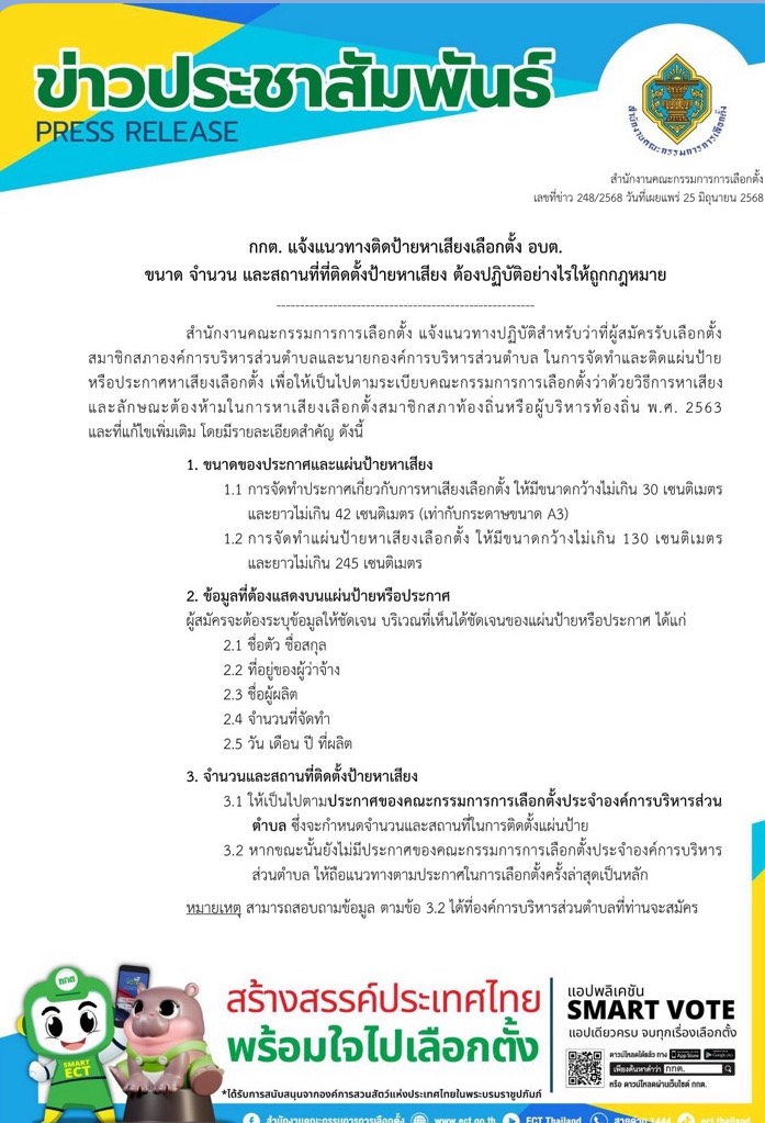 กกต.แจ้งแนวทางติดป้ายหาเสียงเลือกตั้ง อบต. ขนาด จำนวน และสถานที่ที่ติดตั้งป้ายหาเสียง ต้องปฏิบัติอย่างไรให้ถูกกฏหมาย