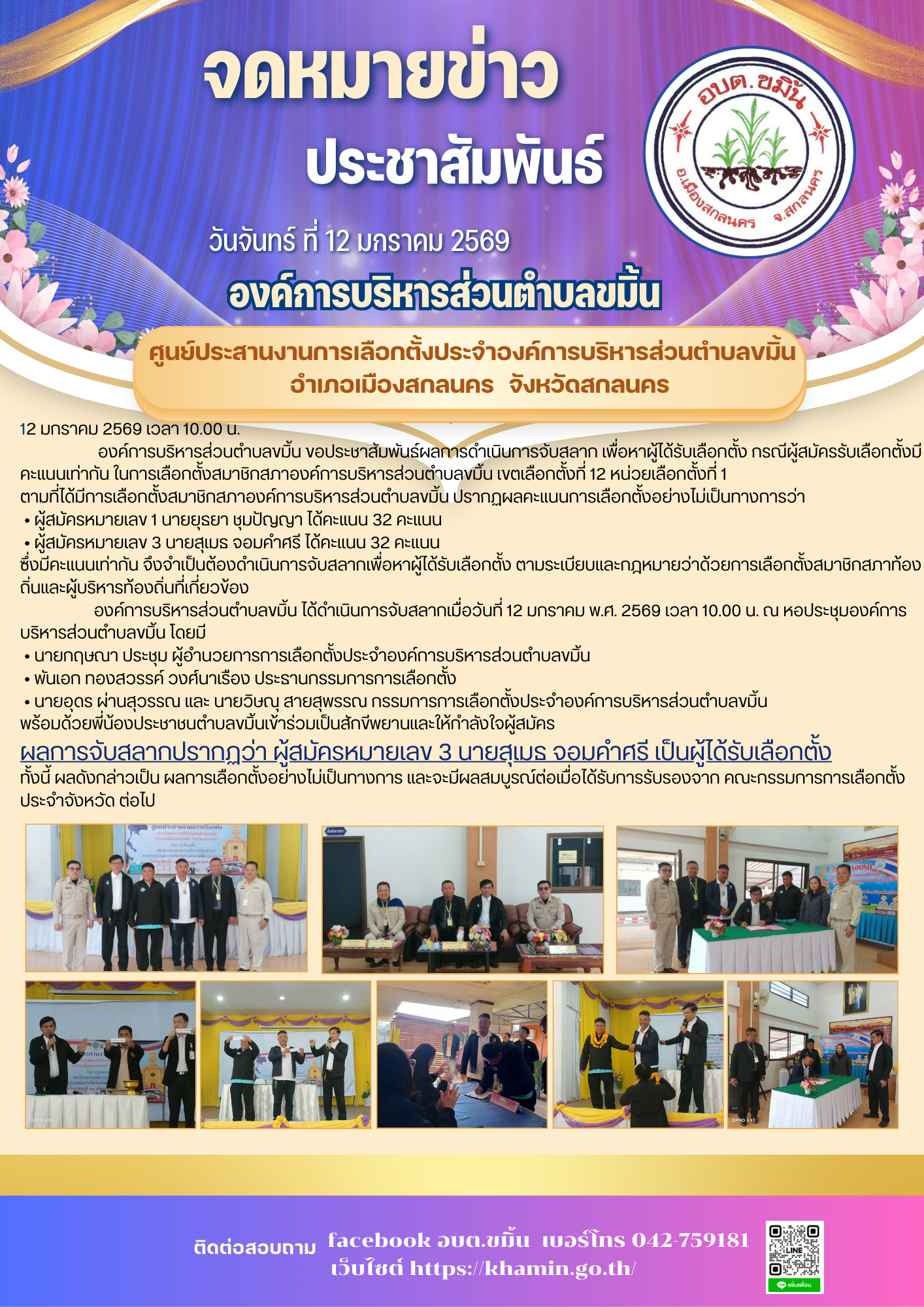 📍องค์การบริหารส่วนตำบลขมิ้น ได้ดำเนินการจับสลากเมื่อวันที่ 12 มกราคม พ.ศ. 2569 เวลา 10.00 น. ณ หอประชุมองค์การบริหารส่วนตำบลขมิ้น โดยมี