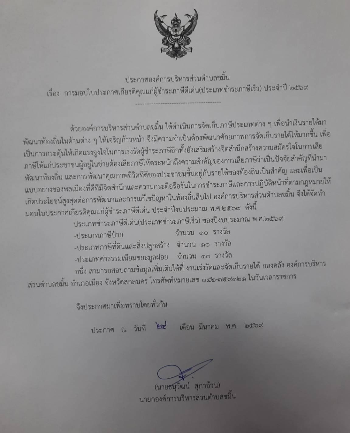 อบต.ขมิ้น ประกาศการมอบใบประกาศเกียรติคุณแก่ผู้ชำระภาษีดีเด่น(ประเภทชำระภาษีเร็ว)ประจำ2569