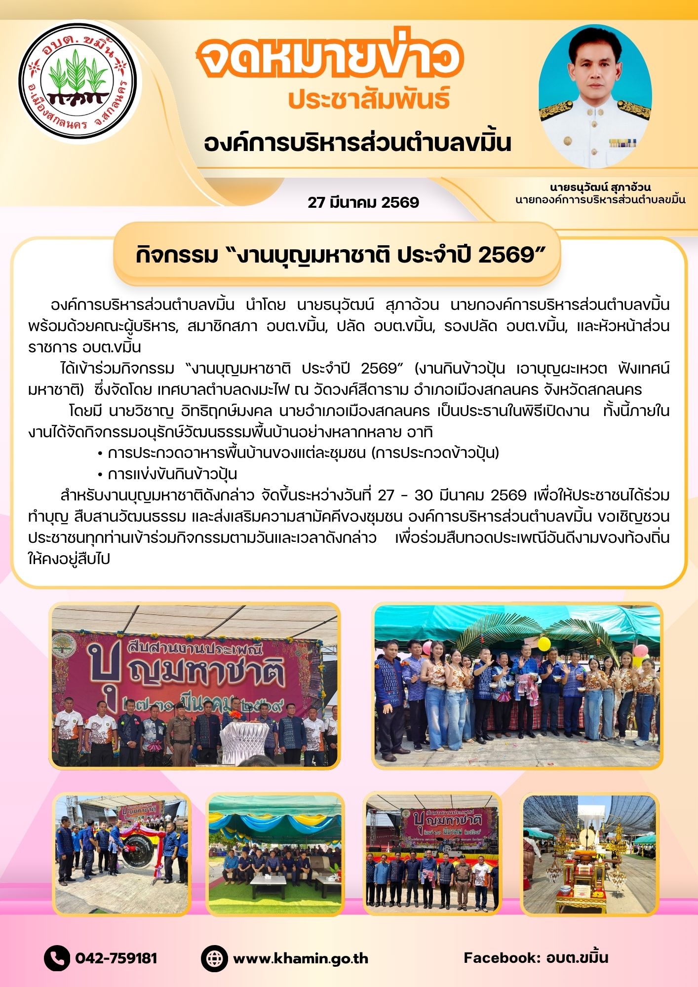 สำหรับงานบุญมหาชาติดังกล่าว จัดขึ้นระหว่างวันที่ 27 – 30 มีนาคม 2569 เพื่อให้ประชาชนได้ร่วมทำบุญ สืบสานวัฒนธรรม และส่งเสริมความสามัคคีของชุมชน