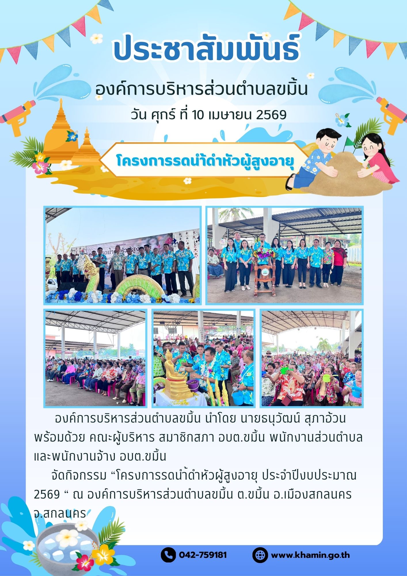 องค์การบริหารส่วนต่าบลขมิ้น น่าโดย นายธนุวัฒน์ สุภาอ้วนพร้อมด้วย คณะผู้บริหาร สมาชิกสภา อบต.ขมิ้น พนักงานส่วนตำบลและพนักงานจ้าง อบต.ขมิ้นจัดกิจกรรม "โครงการรถน้ำดำห้วผู้สูงอาอายุ ประอ่าบีบประนาณ 2569 " ณ องค์การบริหารส่วนต่าบลขมิ้น ต.ขมิ้น อ.เมืองสกลนคร จ.สกลนคร